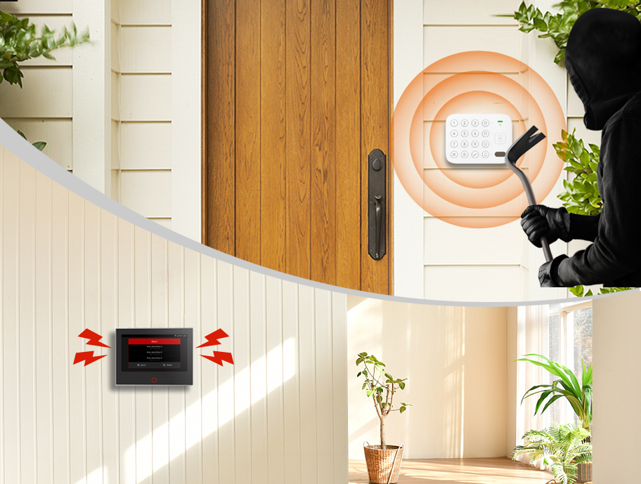 One-Touch Arm/Disarm Instantly activate Away (full property arming), Home (interior zone arming), or Disarm modes via dedicated tactile buttons |